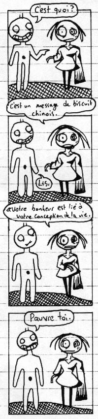 11 C'est quoi? C'est un message de biscuit chinois. Lis. Votre bonheur est lié à votre conception de la vie.. Pauvre toi. << >>