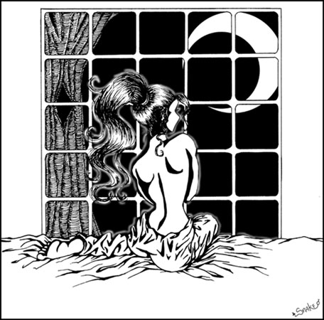 Petite historique: étude de la texture, je l'ai ajoutée dans mon portfolio (en avais-je parlé? je participe à un concours d'animation de télétoon). On voit très mal sur cette image, je l'ai peut-être trop rapetissée, mais il y a de petits motifs sur l'arbre (oui, c'est un arbre) et les cheveux sont mieux vu de plus près.