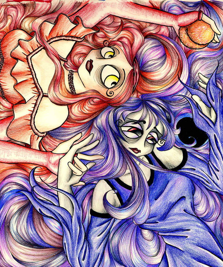 Petite historique: j'ai dessiné ça au salon de thé, c'est là que j'ai rencontré un type qui connaissais quelqu'un suceptible de m'exposer... j'ai colorié tout ça dans la demi-pénomre du salon de thé, à l'arrière, je suis fière d'avoir pu distinguer si bien les couleurs (je me suis rneue comte après que j'avais mis du vert dans le cheveux de la bleue, et que je croyais avoir colorié pas mal de cheveux en jaunes... mais c'était rose/couleur-peau!!! J'ai dessiné aussi deux pièces de vêtement que je venais d'acquérir. Ya un espèce d'effet yin et yan aussi, avec la pêche et le trou noir... mais ça, c'est pas nécessaire de s'en rendre compte... >_<