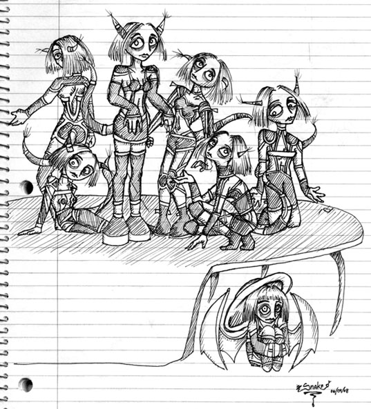 Petite historique: J'en ai dessiné une... puis une autre... et puis... encore un autre, et... Voilà. Maryse m'avait parlé de vêtements qui défient les critères de beauté. J'en ai essayé un peu. Puis j'ai rajouté la bonne femme à chapeau, et puis la table bizarre ensuite. Grâce à ce dessin, je me suis fait une copine dans mon cours d'exploration du domaine des arts et des lettres (ce cours a franchement besoin d'un abbréviation). Elle a vu ce que je dessinais et puis on a jasé. Elle est vraiment sympa. C'est rare. Note: J'ai fait ce dessin directement à l'encre sans brouillon à mine, c'est pourquoi les proportions sont pas géniales, mais on s'en fout pour ce dessin-là.