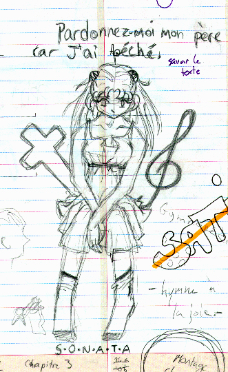 Petite historique: C'est en gros à quoi ressemble la page couverture de mon chapitre 3 dans mon projet personnel. D'ailleurs, à l'heure où j'écris ces lignes, il ne me reste que le chapitre trois à faire, et ensuite, j'ai tou fini et je met ma BD online!!! Yahou!