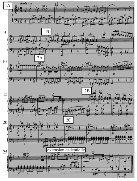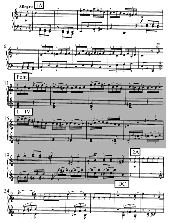 Les mesures 11 à 22 (premier temps) sont considérées ici comme un pont, car la modulation se fait au début de la partie foncée, et celle-ci se termine par une demi-cadence dans le ton de la dominante, juste avant que s’enchaîne le deuxième groupe de thèmes.