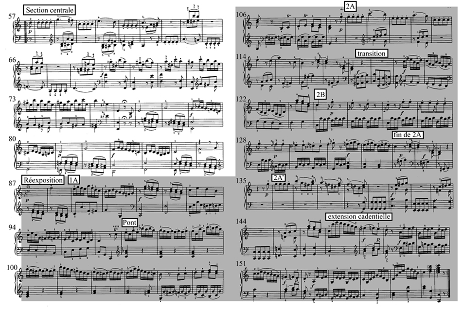 Petite précision sur le « mouvement mélodique qui s’apparente davantage à un thème qu’à un élément de transition » : Charles Rosen, dans son ouvrage Le style classique, fait mention de ce phénomène qu’il appelle « remplissage » :
