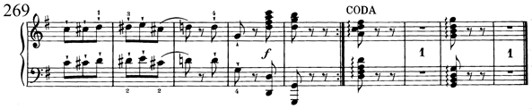 Ci-contre : exemple 09 : sonate no 5, K283 (189h) en sol majeur, troisième mouvement, mes 269-277