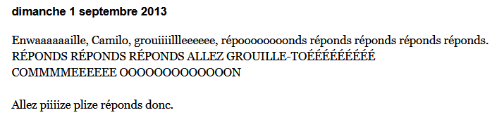Il me donne rendez-vous au métro place st-henri, rendue là il me texte pour me dire de venir le rejoindre à vendôme, rendue là il m'explique qu'il a perdu les clefs de son nouvel appart, on cherche à terre dans la rue. On poireaute devant sa porte en attendant que quelqu'un entre dans le bloc et nous fassent rentrer, on va prendre une bière dans un bar miteux proche et on revient après pour attendre, les colocs du gars arrivent mais ils ont pas les clefs, puis une autre gang finit par arriver et eux non plus ont pas les clefs. Faque on se ramasse une dizaine de personnes à attendre en face des portes du building jusqu'à temps qu'un téméraire se tanne par sonne chez quelqu'un au hasard pour qu'on nous ouvre.